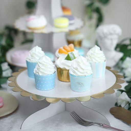 1 Tier | 13" Blue Cardboard Cucake Stand | Gold Scalloped Edge Mini Dessert Cake Holder